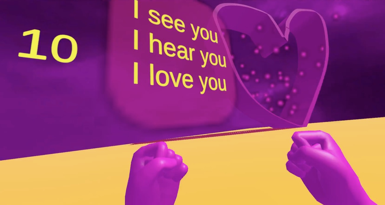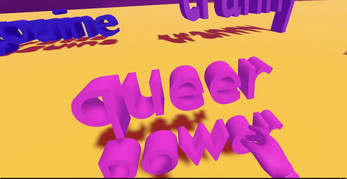 In addition to their fists. Participants also have access to two love words: a heart and “queer power”. These objects can be picked up and used to hit the swear words. These love words enable people with reduced mobility to complete the experience without the effort of boxing, or simply to explore another way of interacting with words.
